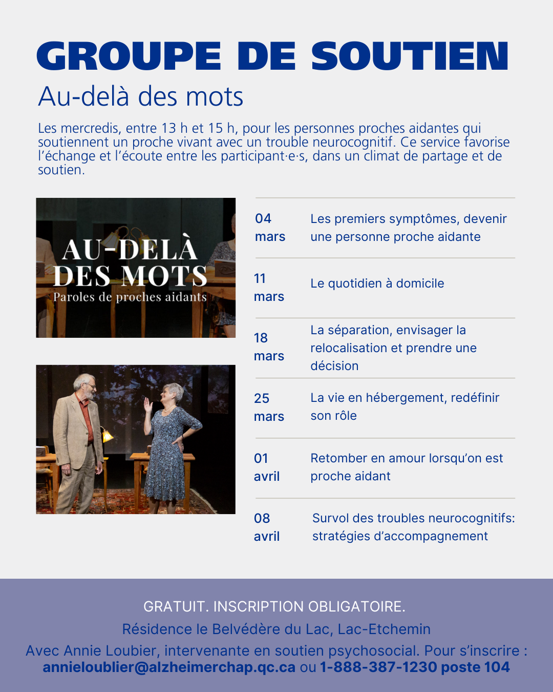 La Société Alzheimer Chaudière-Appalaches offre le groupe de soutien Au-delà des mots, un service gratuit destiné aux personnes proches aidantes qui accompagnent un proche vivant avec un trouble neurocognitif, comme la maladie d’Alzheimer ou une maladie apparentée.